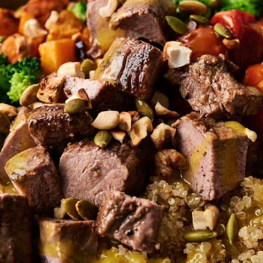 Bowl de carne en cubos, quinoa, vegetales y crunchy de frutos secos