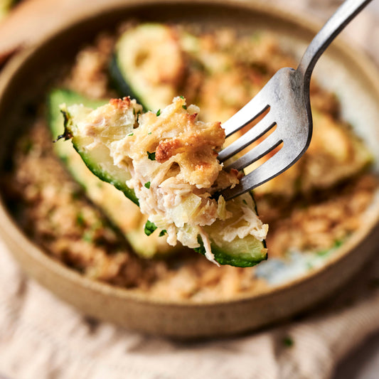 Calabacín relleno de pollo desmenuzado acompañado de arroz integral