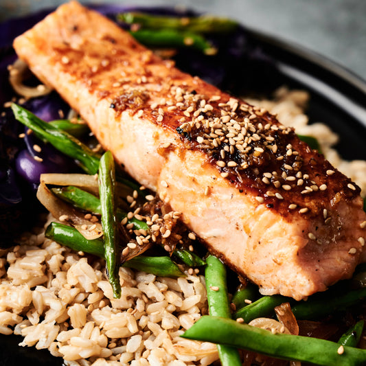 Salmón teriyaki con col asada, arroz blanco, judías verdes al sésamo y cebolla tierna