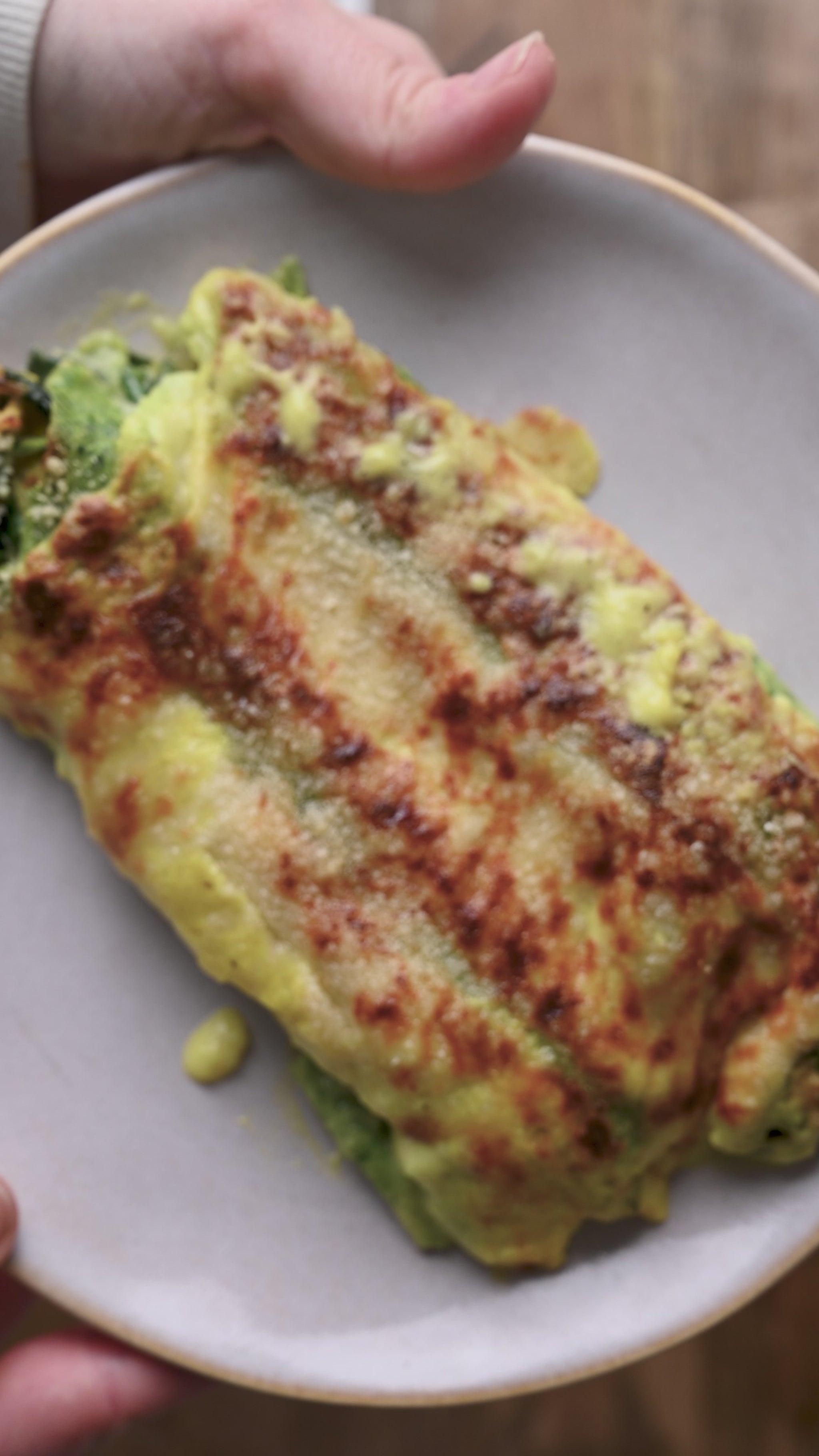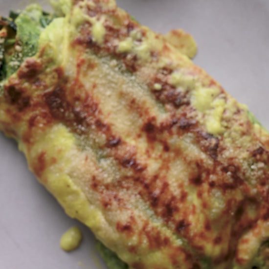 Una opción innovadora y gourmet: finos crêpes verdes elaborados con espinaca, huevo y harina de avena, rellenos con un salteado cremoso de salmón desmenuzado, espinaca, cebolla y puerro, ligado con una bechamel suave de cúrcuma y leche vegetal. Todo se termina al horno, cubierto con más bechamel y un toque de queso parmesano para gratinar. Una comida funcional, alta en proteína, libre de ultraprocesados y perfecta para potenciar tu energía diaria.