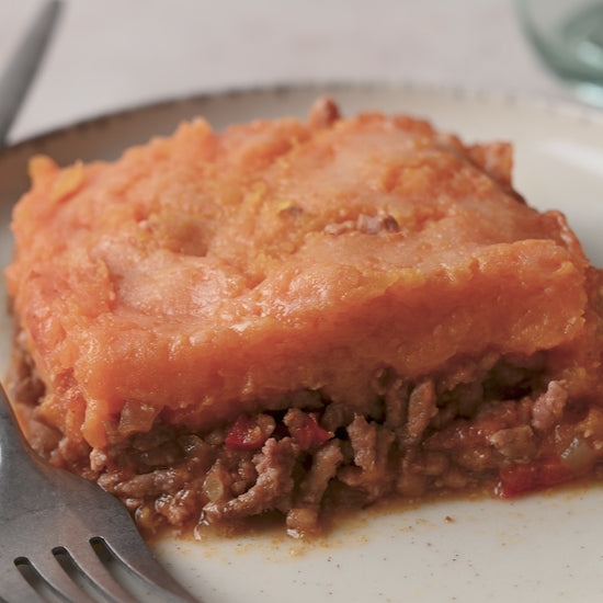 Un pastel reconfortante y nutritivo que combina la suavidad de un puré cremoso de calabaza y boniato con una capa jugosa de carne de res cocida lentamente con tomate, cebolla y pimiento rojo. Todo coronado con un gratinado dorado irresistible que potencia los sabores naturales del plato.