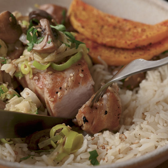 Jugosa pechuga de pavo sellada a la sartén y bañada en una cremosa salsa casera de puerro y setas al ajillo, acompañada de arroz jazmín cocido al punto y rodajas de calabaza asada al horno. Un plato sabroso, reconfortante y cargado de proteínas de alta calidad para alimentar tu rendimiento diario.